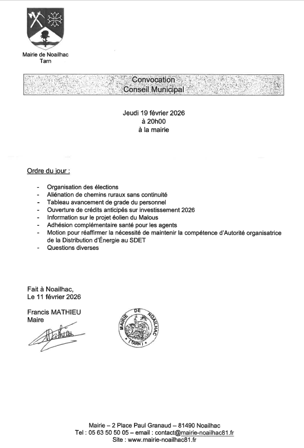 Convocation Conseil Municipal – jeudi 19 février 2026